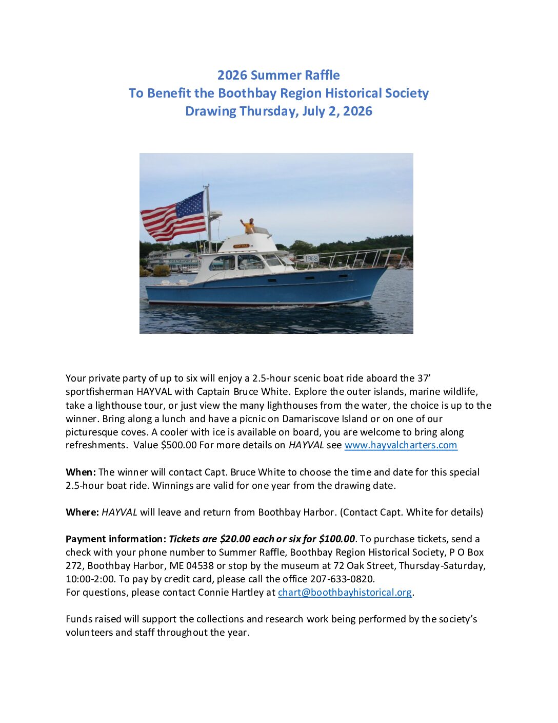 For more information contact the office at 207-633-0820 or email info@boothbayhistorical.org Thursday through Saturday, 10:00am-2:00pm.